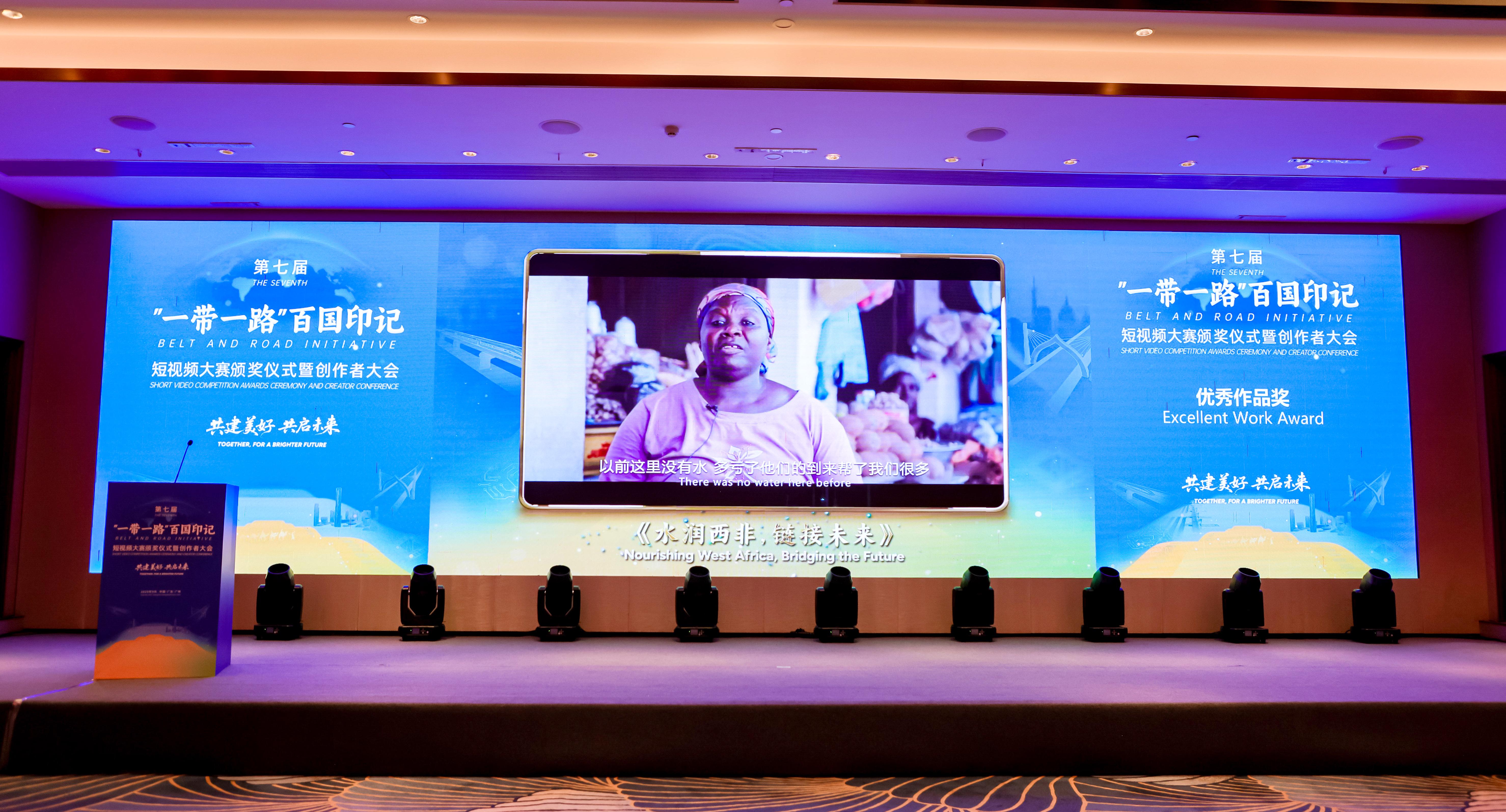 大會(huì)頒獎(jiǎng)現(xiàn)場(chǎng) 《水潤(rùn)西非 鏈接未來(lái)》以中國(guó)地質(zhì)在科特迪瓦實(shí)施民生供水工程,惠及當(dāng)?shù)匕傩諡楸尘埃靡粠瑤?huà)面,生動(dòng)講述了中國(guó)地質(zhì)20多年來(lái),先后在科完成2000多眼水井、100多個(gè)農(nóng)村供水改善系統(tǒng)工程和多個(gè)主要城市供水項(xiàng)目的實(shí)踐故事,用鏡頭繪就了一幅跨越山海、民心相通的時(shí)代長(zhǎng)卷,充分展現(xiàn)了中國(guó)地質(zhì)作為“一帶一路”倡議踐行者和人類命運(yùn)共同體理念建設(shè)者的生動(dòng)形象。 第七屆“一帶一路”百國(guó)印記短視頻大賽以“共建美好,共啟未來(lái)”為主題,由中國(guó)公共外交協(xié)會(huì)、環(huán)球網(wǎng)聯(lián)合主辦,國(guó)務(wù)院國(guó)資委新聞中心等單位協(xié)辦,共征集全球130余個(gè)國(guó)家和地區(qū)的2000部作品。經(jīng)過(guò)組委會(huì)初篩,大眾票選、專家評(píng)審等多輪角逐,最終161部作品脫穎而出。據(jù)統(tǒng)計(jì),大賽作品全球總播放量累計(jì)突破17億,其中海外播放量達(dá)2億。此次公司獲此殊榮,進(jìn)一步提升了“中國(guó)地質(zhì)”品牌在國(guó)內(nèi)外的影響力,為公司樹(shù)立了良好的國(guó)際形象。