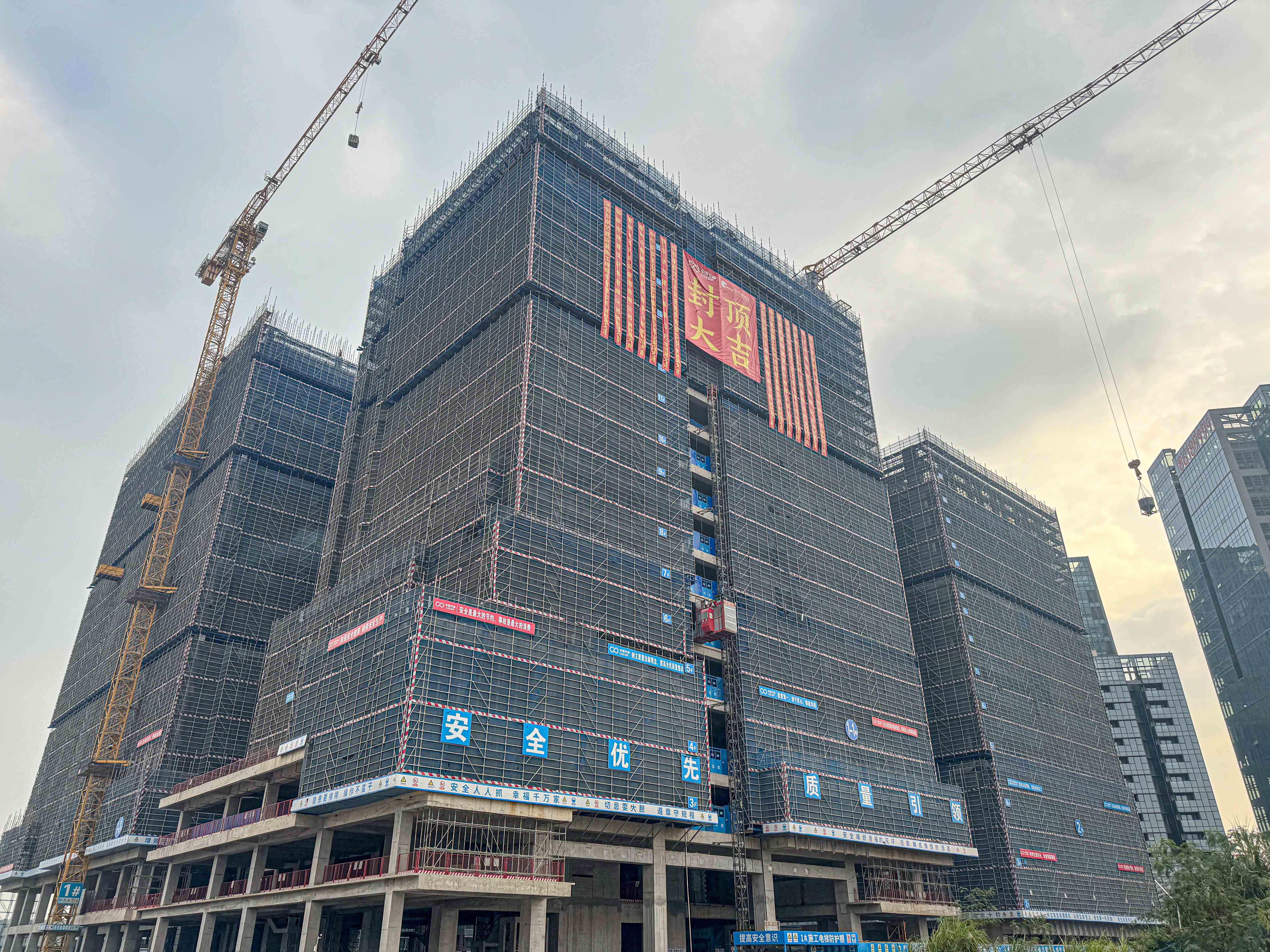 項目開工以來,建設團隊始終堅持“高標準、嚴要求、快節奏”的工作理念,克服臺風天氣、場地條件有限、工期緊張等困難,全力開展“保安全 保品質 保節點 奮戰60天”行動,一方面搶抓有利天氣窗口趕超進度,另一方面積極引入智能建造技術,科學統籌施工安排,強化質量管理,最終圓滿達成主體結構全面封頂目標。
